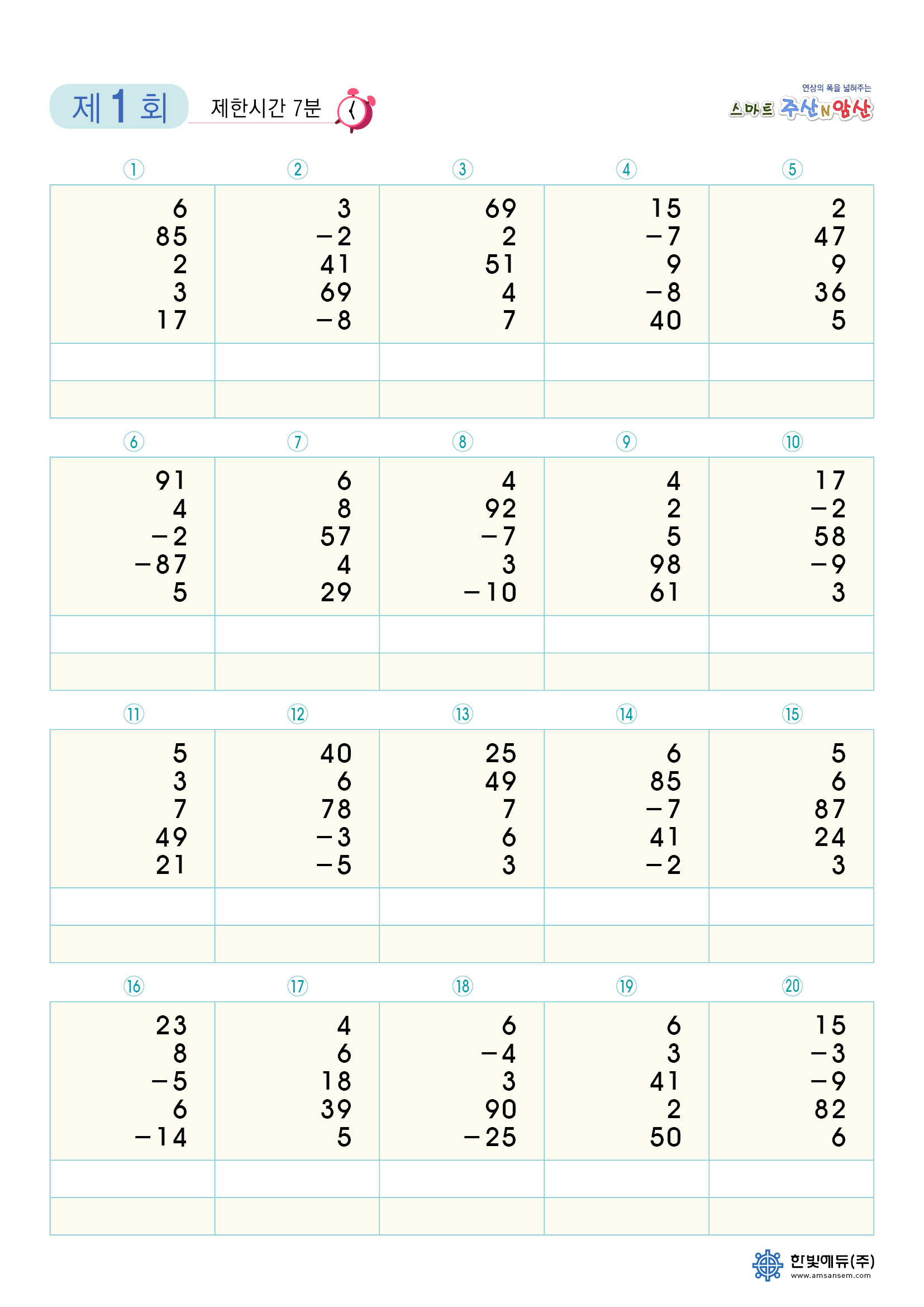 주산으로 계산하는 경우 제한시간 7분 (암산하기 전 단계로 연습)